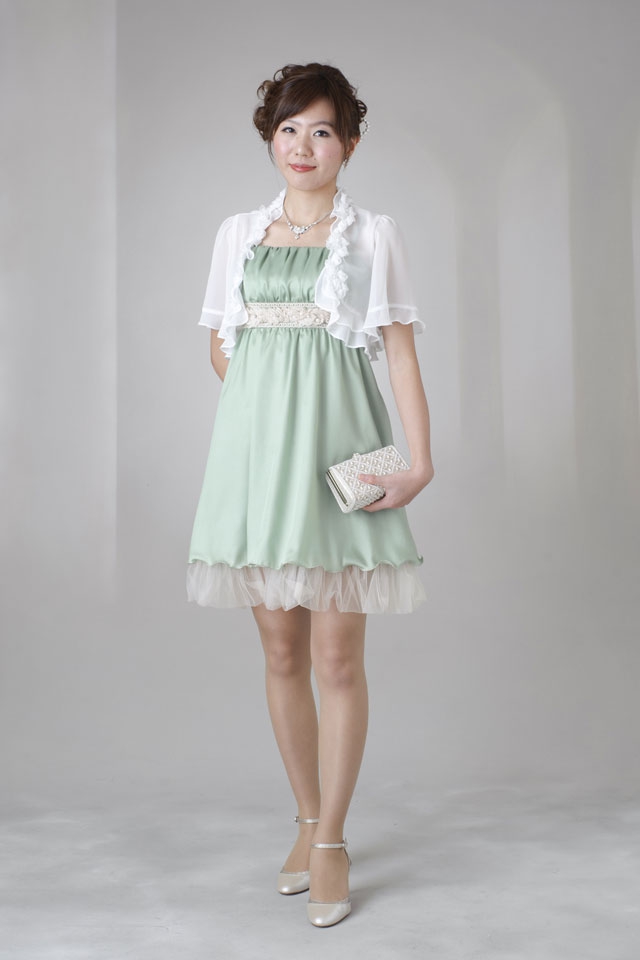 - 若草色にエンパイヤラインにリボンとパール付花 洋服サイズ:7号~11号サイズ調整可能 表地:ポリエステル ナイロン