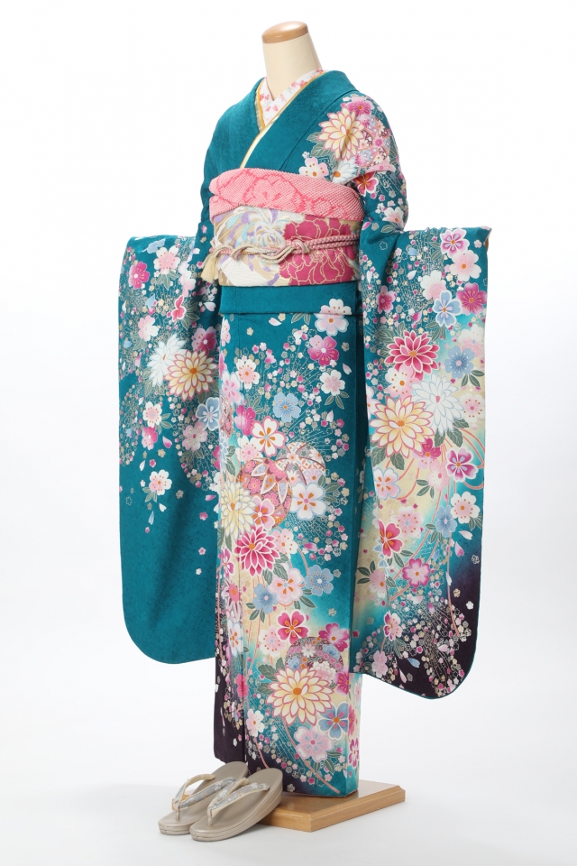 - fs207【振袖レンタル】グリーン地 裾紫ぼかし 花々(裄長め) 洋服サイズ:~13号対応 表地:正絹