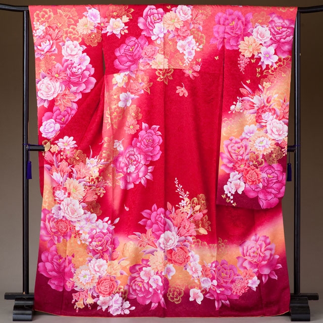 fs225【振袖レンタル】赤.オレンジ 全体に大きなバラ(裄長め)