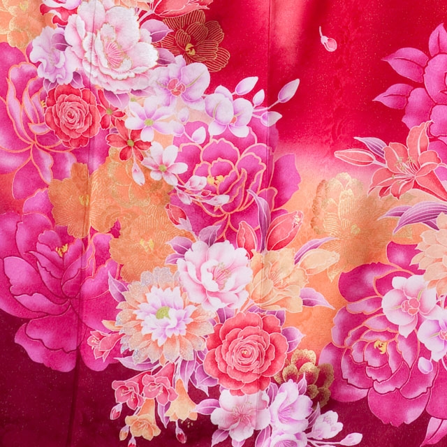 - fs225【振袖レンタル】赤.オレンジ 全体に大きなバラ(裄長め) 洋服サイズ:~13号対応 表地:正絹