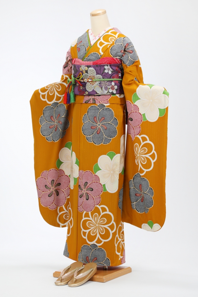 - fk099【レンタル】からし地に大輪の花々 洋服サイズ:~13号対応 表地:ポリエステル