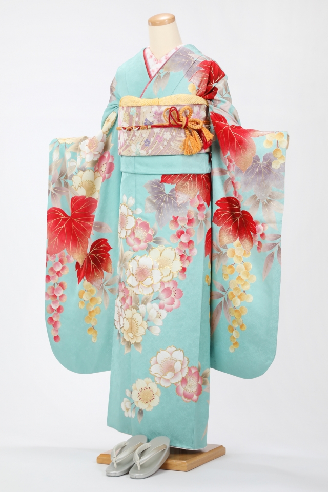 fs402【振袖レンタル】水色 南天と桜(裄長め)