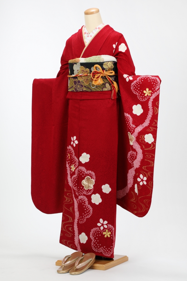 fs159【振袖レンタル】赤 しぼり風柄に梅の花(裄長め)