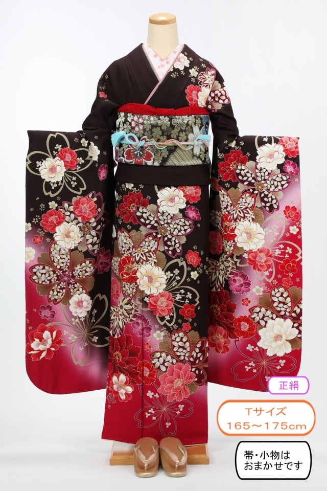 fs221【振袖レンタル】あずき色しぼり花柄 (裄長め)