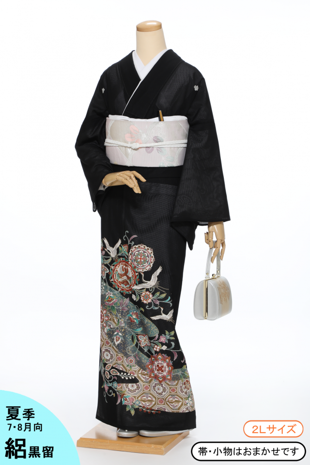 kr03【黒留袖 絽 夏用】御所車と鶴 平安調絵巻