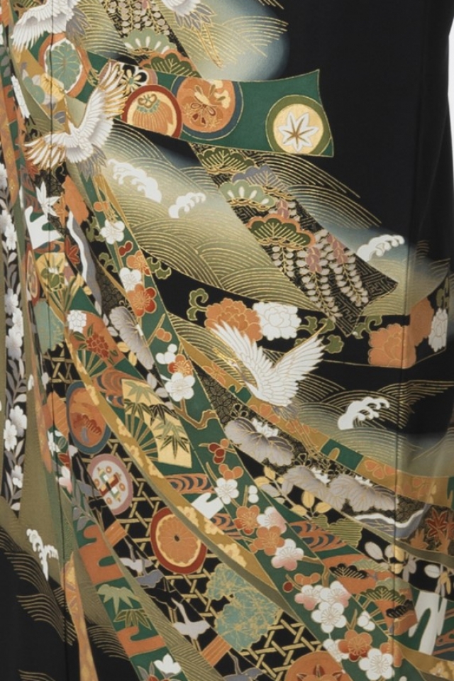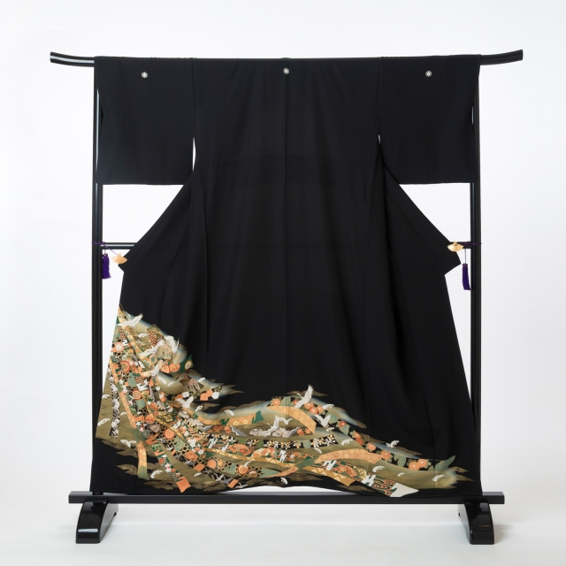 ks108【黒留袖レンタル】熨斗目 鶴と鎌倉文