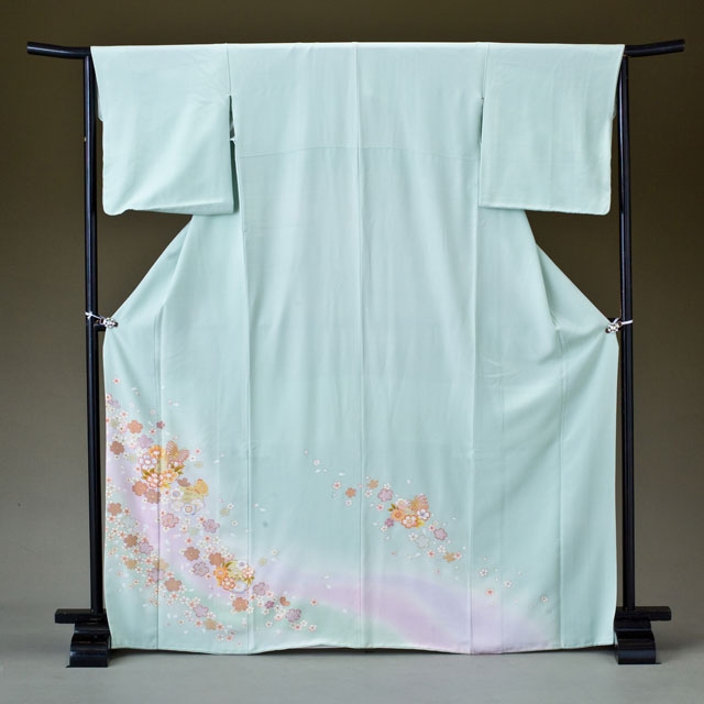 - is23【色留袖レンタル】淡いグリーンに蝶や花々 (裄 長め) 三つ紋 洋服サイズ:7号~13号対応 表地:正絹