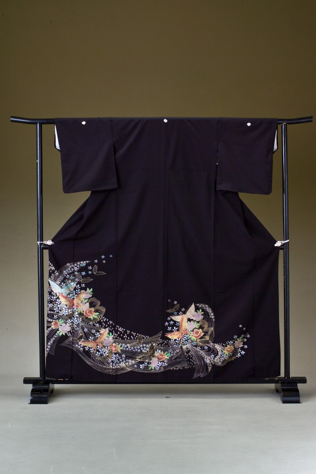 - k21【黒留袖レンタル】ラメ金銀蝶 洋服サイズ:~13号対応 表地:ポリエステル